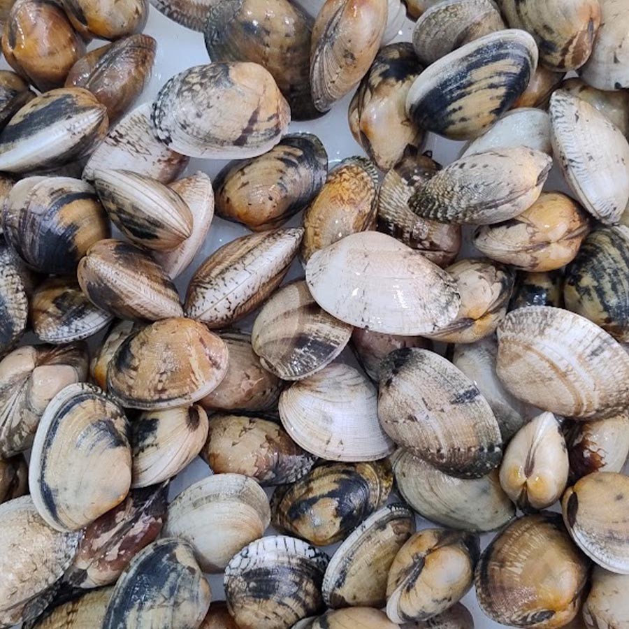 La almeja babosa se distingue por sus diferentes tonos grisáceos, blancos y marrones. Es con la almeja fina la variedad más apreciada para hacer las típicas almejas “a la marinera”. De carne muy sabrosa y tierna.